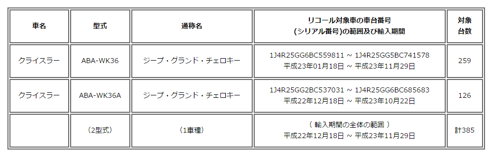クライスラー日本株式会社は、平成27年6月30日にクライスラー/ジープ/ダッジ車につ