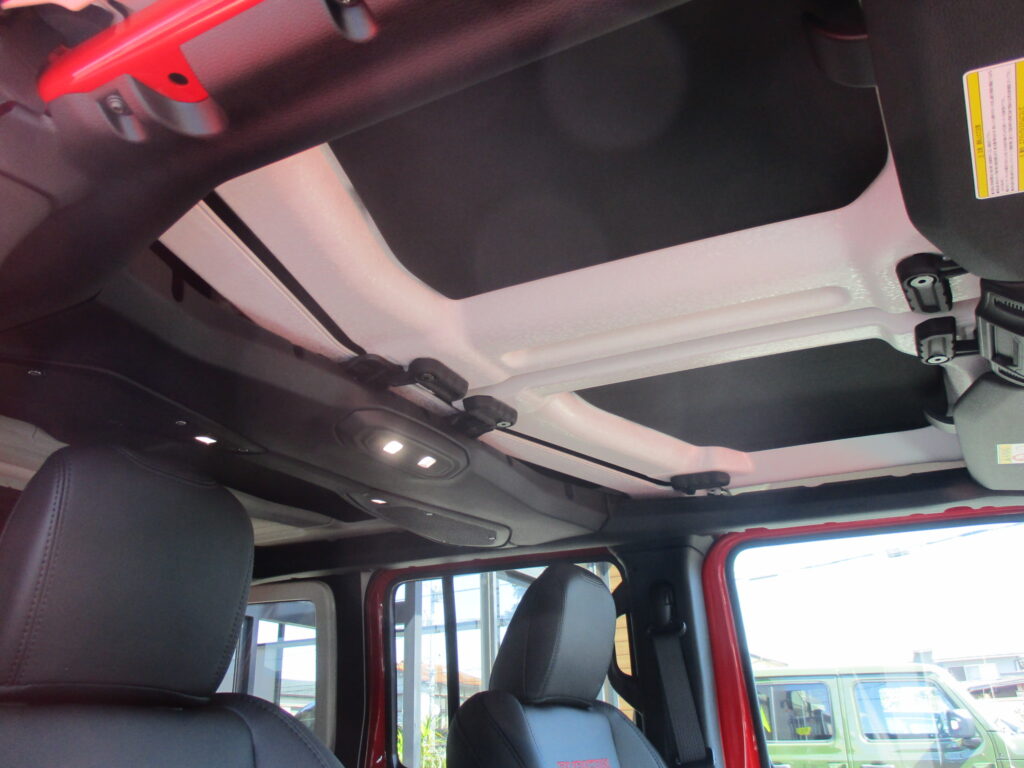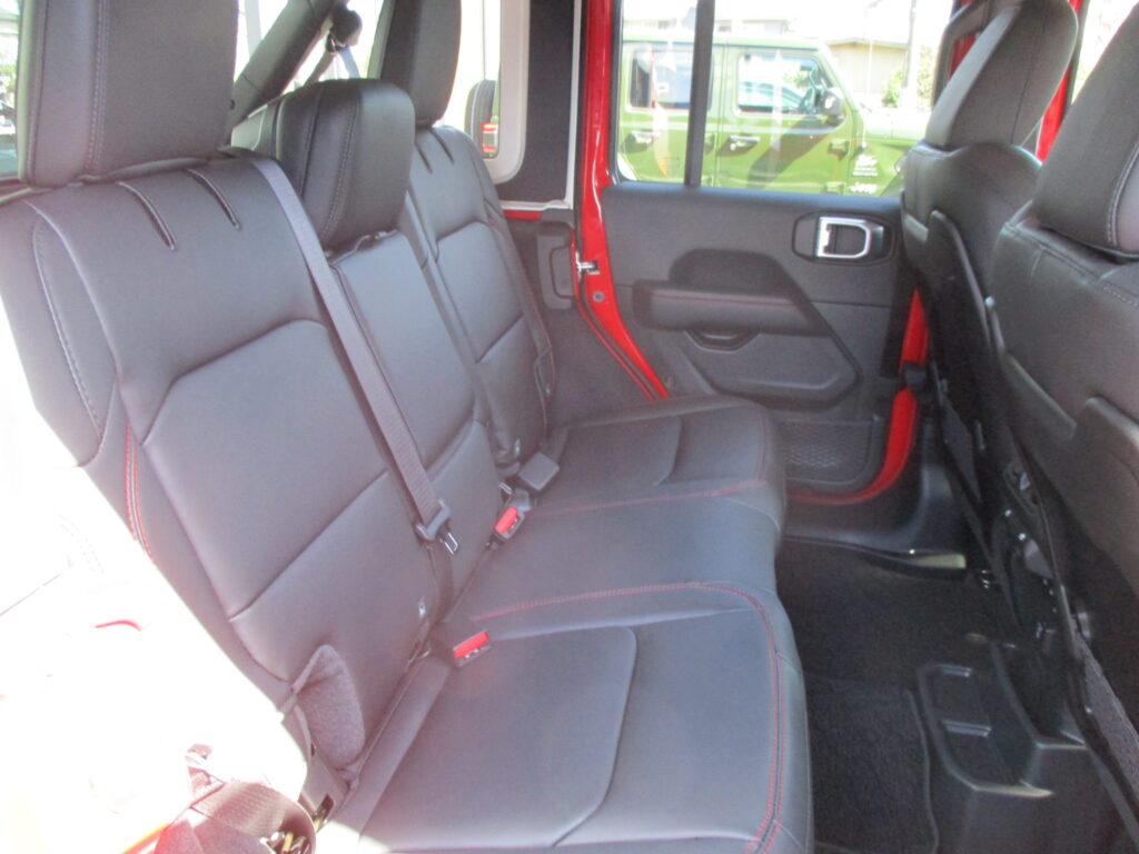 シートにはRUBICONロゴ入りとレッドステッチでインテリアも赤色のアクセントがボディカラーとの統一感がありますね!