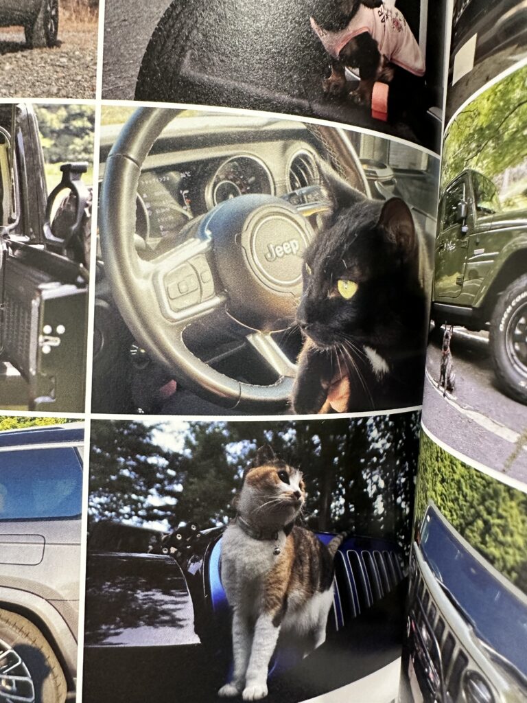 猫ちゃんとジープのお写真が掲載されています。