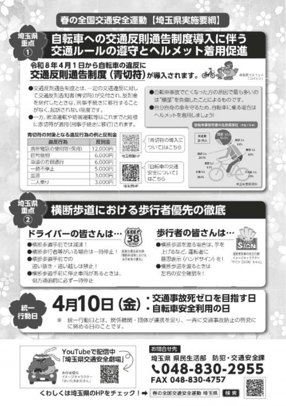 埼玉県では「自転車への交通反則通告制度に伴う交通ルールの遵守とヘルメット着用促進」「横断歩道における歩行者優先の徹底」を重点として運動を実施。